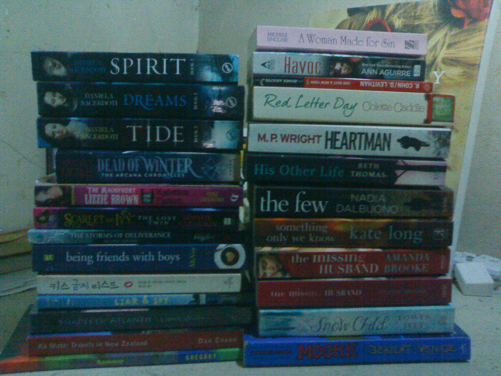 This is kind of a make-up post and I have stuff to giveaway! By stuff I mean a whole lot of books!